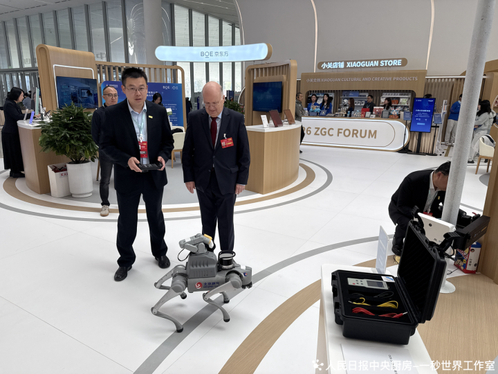 2026中关村论坛年会现场,一名外国嘉宾正在了解智能巡检机器人。人民日报记者孔歌摄