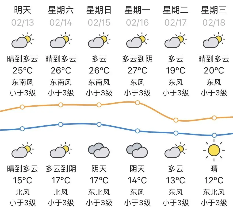预计,13-15日我市晴到多云为主,早晚有(轻)雾,气温逐渐上升,昼暖夜凉,请适时添减衣物。